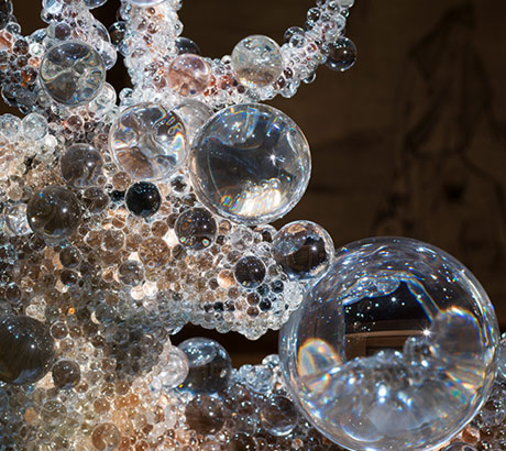名和的作品靈感經常來自于探討cells—細胞及Skins—表層,再以透明的媒材:玻璃珠,三菱鏡,樹脂,矽油等作為主要材料。